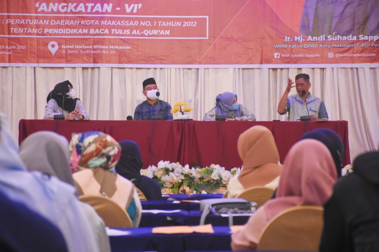 MAKASSAR, DATAKITA.CO – Wakil Ketua DPRD Kota Makassar, Andi Suhada menggelar sosialisasi Peraturan Daerah (Perda) nomor 1 tahun 2012 tentang Baca Tulis Alquran di Hotel Horison, Minggu (25/4/2021). Ada dua narasumber yang hadir pada kesempatan ini. Yakni, Raisul Jaiz dan Aswis Badwi.