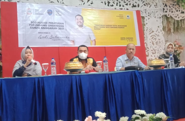 MAKASSAR, DATAKITA.CO – Anggota DPRD Kota Makassar, Andi Suharmika menggelar sosialisasi perda nomor 2 Tahun 2019 tentang Rumah Susun. Kegiatan ini dilaksanakan di Hotel Sarison, Jalan Perintis Kemerdekaan, Minggu (27/6/2021).