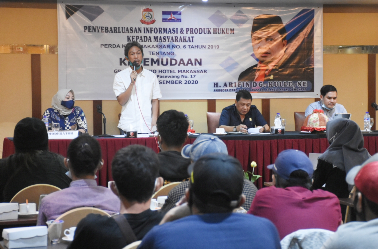 MAKASSAR, DATAKITA.CO – Anggota DPRD Kota Makassar, Arifin Dg Kulle melakukan tatap muka dengan konstituen. Kali ini, legislator Demokrat itu menggelar sosialisasi Perda nomor 6/2019 tentang Kepemudaan di Hotel Grand Celino, Sabtu (5/12/2020).