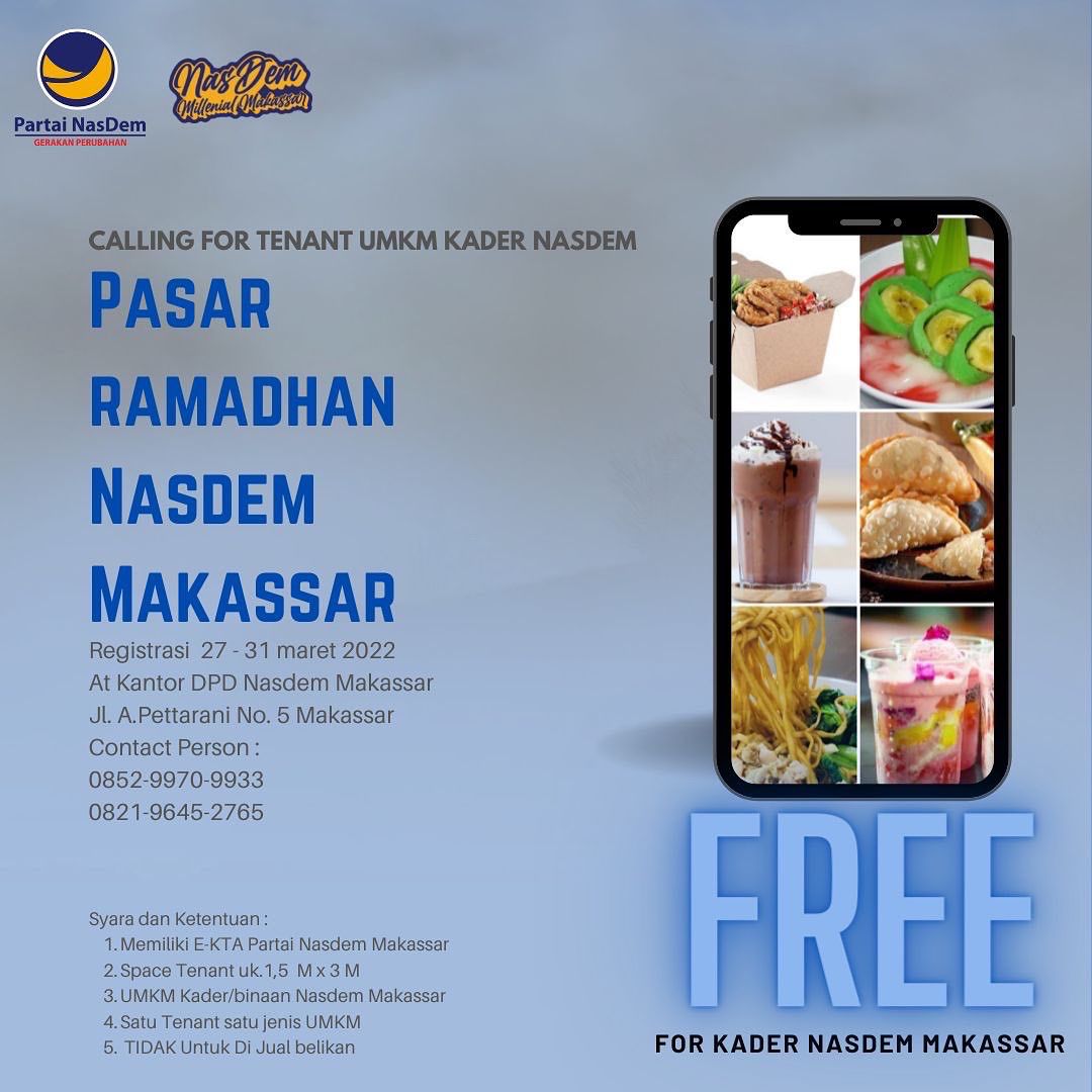 MAKASSAR, DATAKITA.CO – Selama satu bulan penuh di bulan Ramadan 1443 Hijriah/Tahun 2022, DPD Partai Nasdem Kota Makassar akan mengadakan Pasar Ramadan Nasdem Makassar.