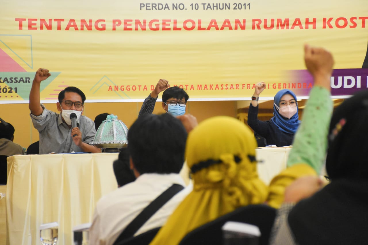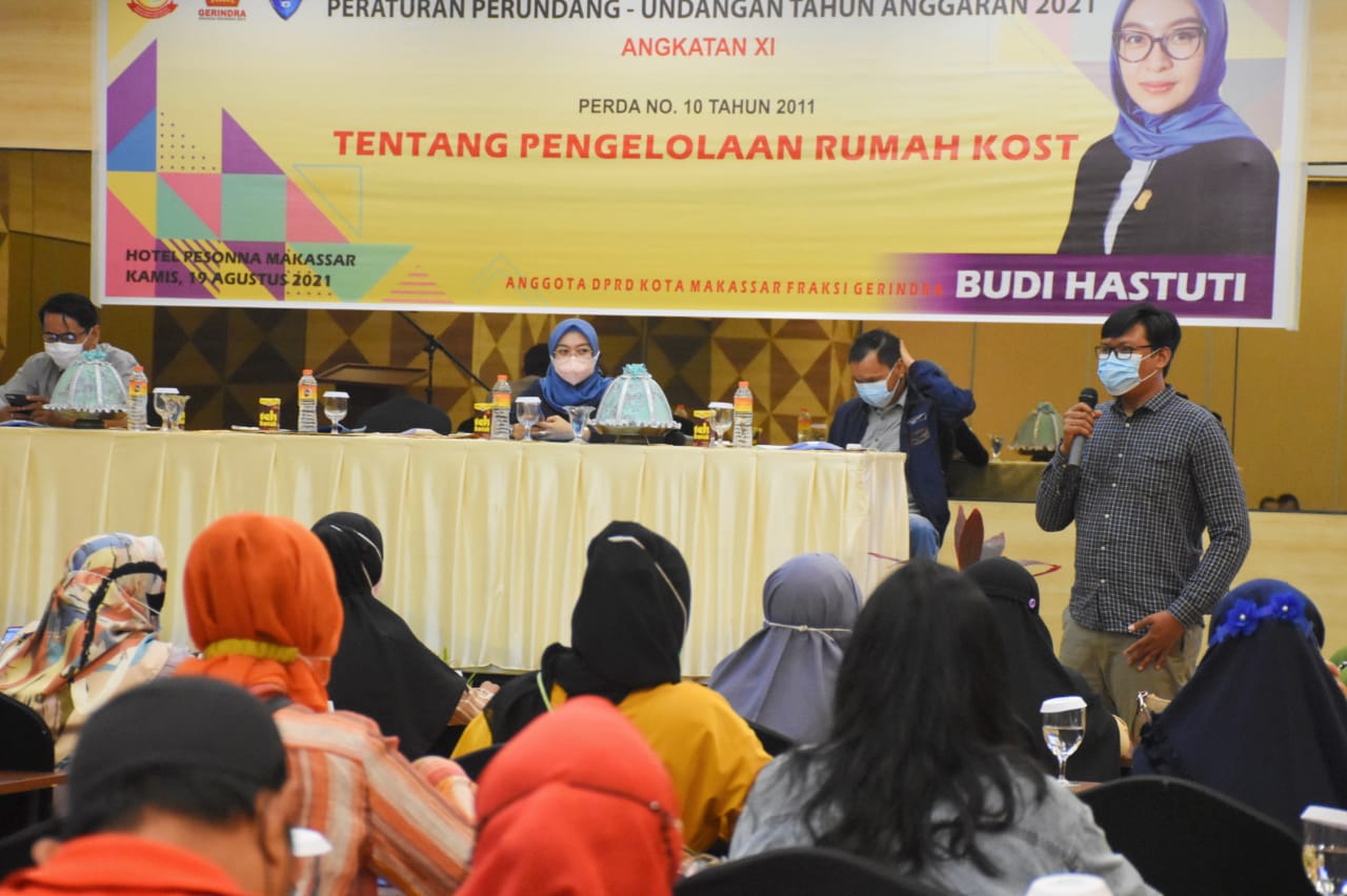 MAKASSAR, DATAKITA.CO – Anggota DPRD Kota Makassar, Budi Hastuti menggelar sosialisasi peraturan daerah (perda) nomor Nomor 10 Tahun 2011 tentang Pengelolaan Rumah Kost di Hotel Pessona, Kamis (19/8/2021).
