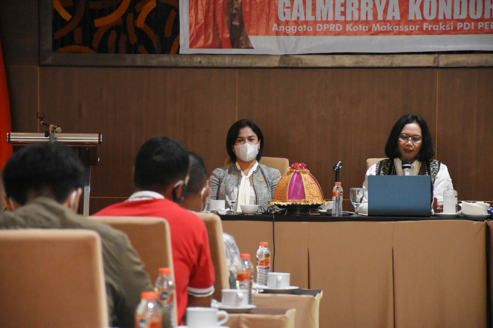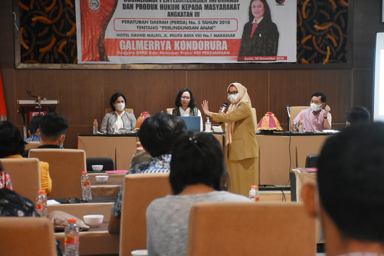 MAKASSAR, DATAKITA.CO – Anggota DPRD Kota Makassar, Galmeryya Kondorura melaksanakan agenda tatap muka dengan konstituen. Kegiatan ini sosialisasi penyebarluasan informasi dan produk hukum Perda tentang Perlindungan Anak, di Hotel D’Maleo, Senin (30/11/2020).