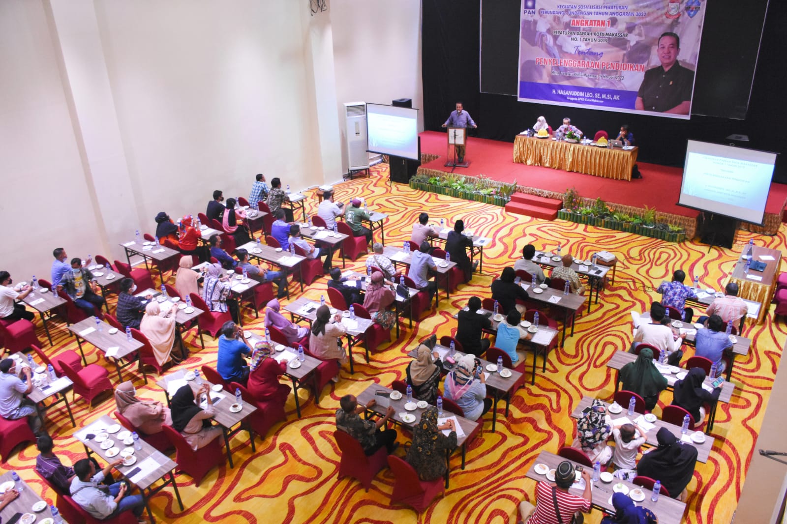 Sosialisasi Perda yang dilakukan Hasanuddin Leo terkait Perda Kota Makassar Nomor 1 tahun 2019 tentang Penyelenggaraan Pendidikan, di Hotel Travellers Phinisi Makassar, Jalan Lamadukelleng Buntu, Sabtu (19/2/2022).
