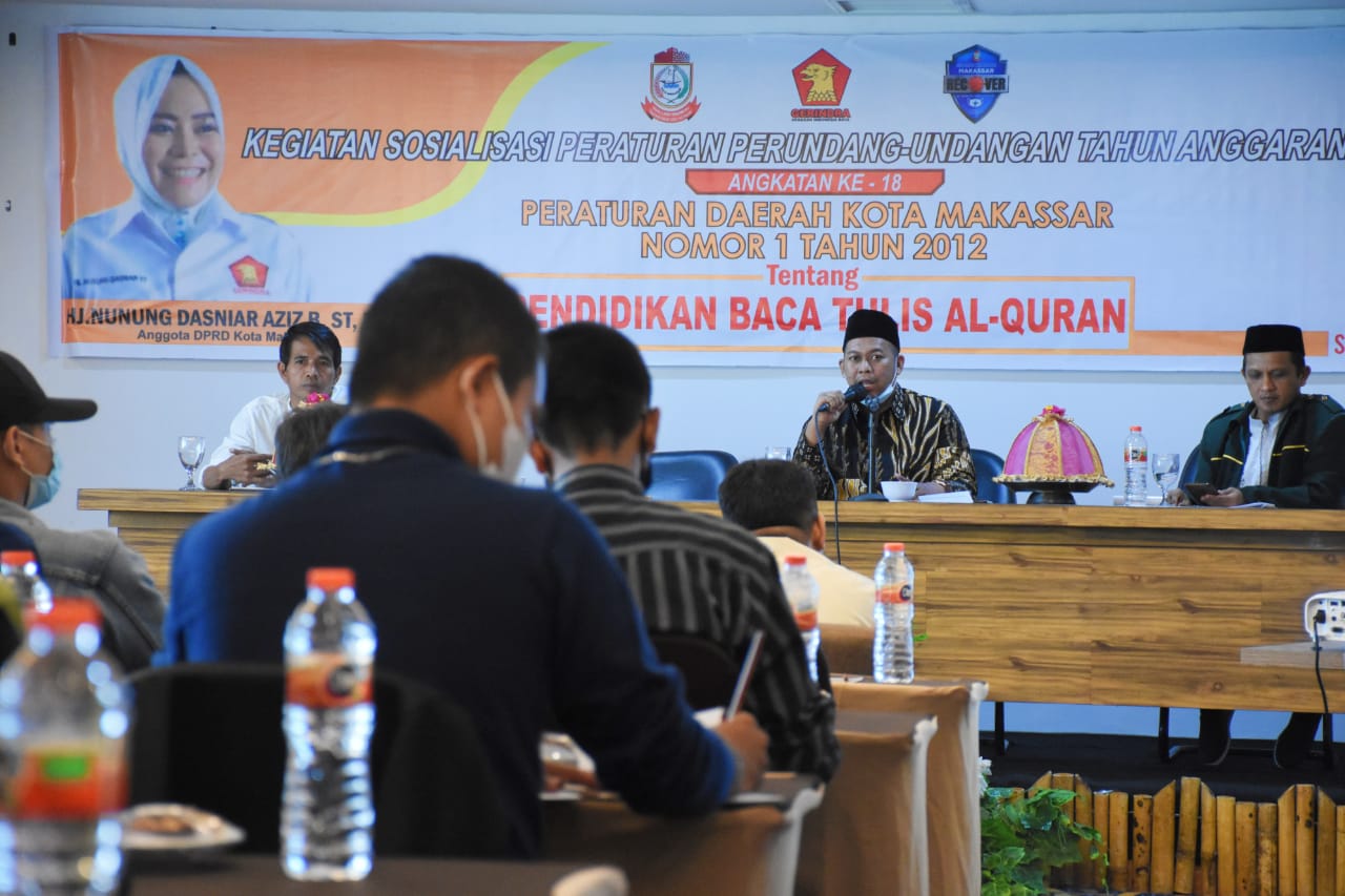 MAKASSAR, DATAKITA.CO – Anggota DPRD Kota Makassar, Nunung Dasniar menggelar sosialisasi peraturan daerah (perda) nomor 1 tahun 2012 tentang Pendidikan Baca Tulis Alquran di Hotel Grand Maleo, Selasa (23/11/2021).