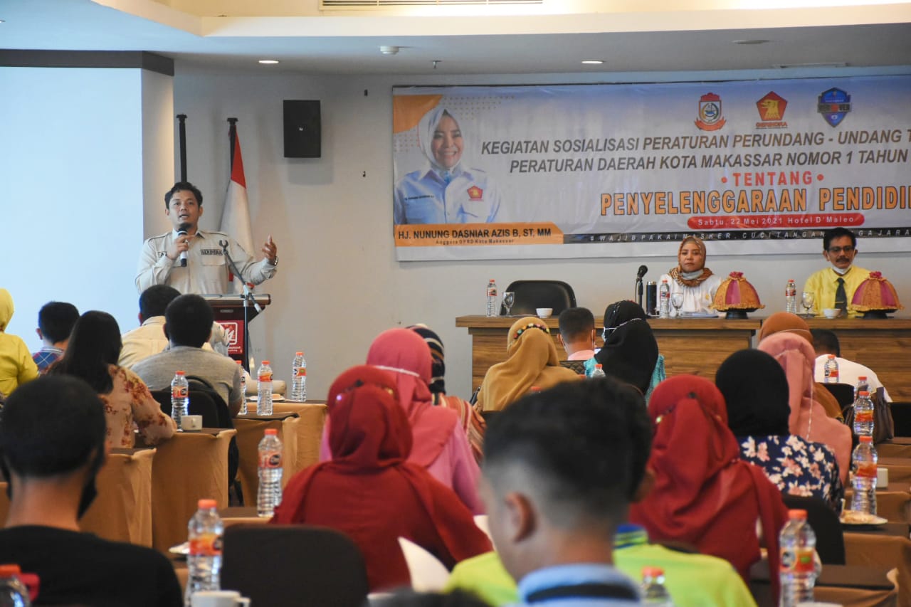 MAKASSAR, DATAKITA.CO – Anggota Dewan Perwakilan Rakyat Daerah (DPRD) Kota Makassar, Nunung Dasniar melakukan sosialisasi peraturan daerah (Perda) nomor 1 Tahun 2019 tentang penyelenggaraan Pendidikan, berlangsung, di Hotel Grand Maleo, Sabtu (22/5/2021).