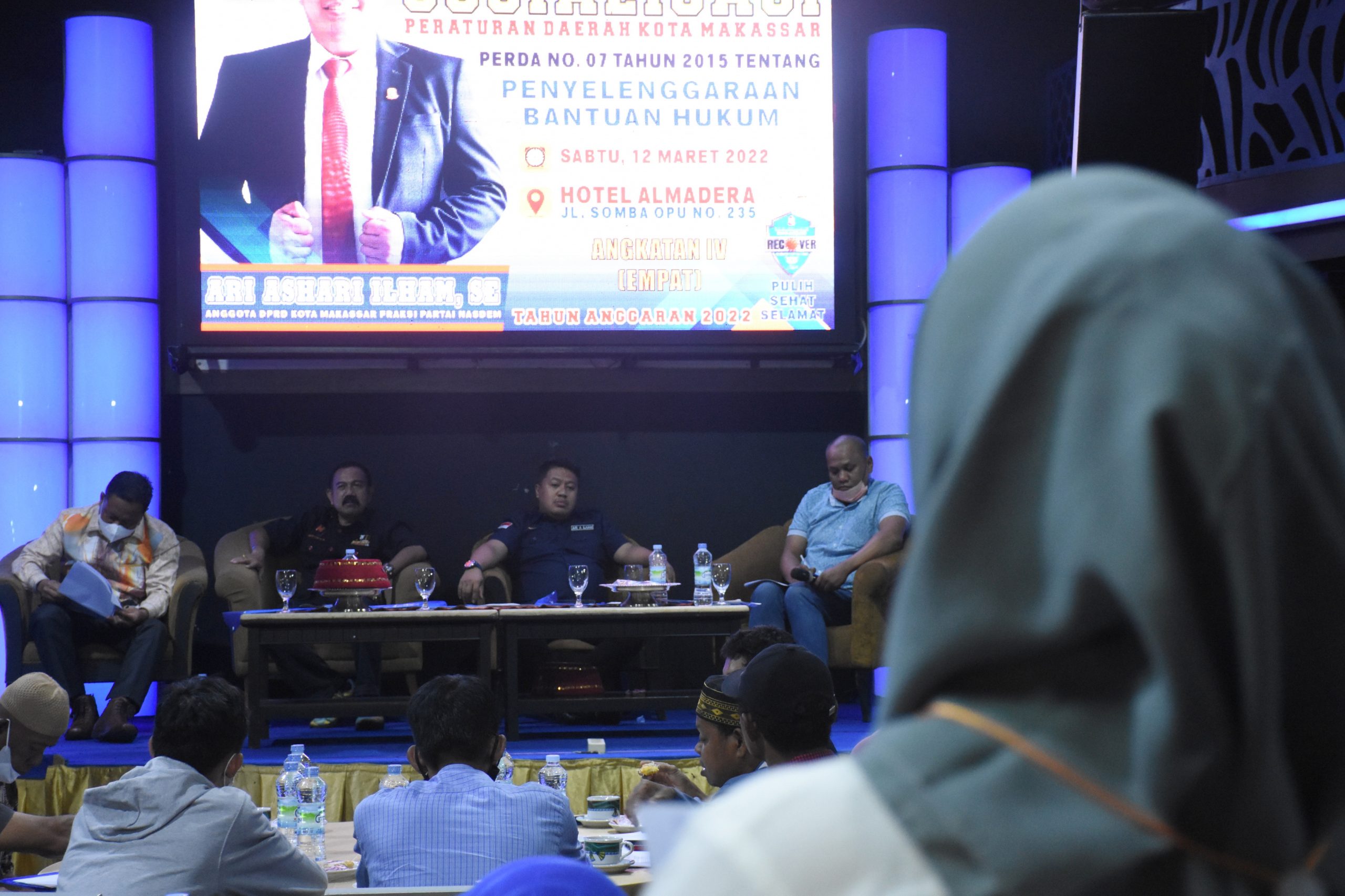 MAKASSAR, DATAKITA.CO – Anggota DPRD Kota Makassar, Ari Ashari Ilham menggelar sosialisasi peraturan daerah (Perda) nomor 7 tahun 2015 tentang Penyelenggaraan Bantuan Hukum di Hotel Almadera, Jalan Somba Opu, Sabtu (12/3/2022).