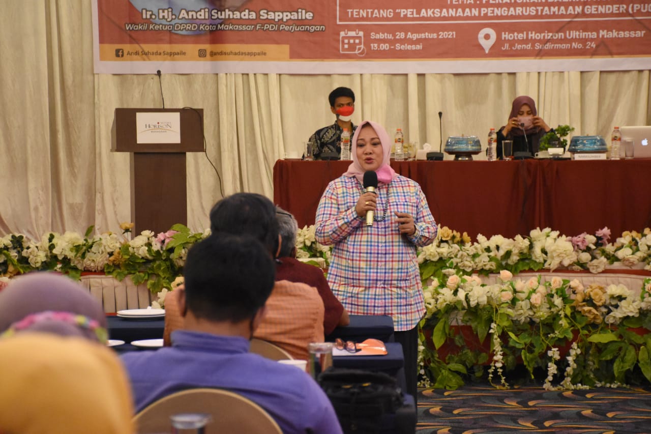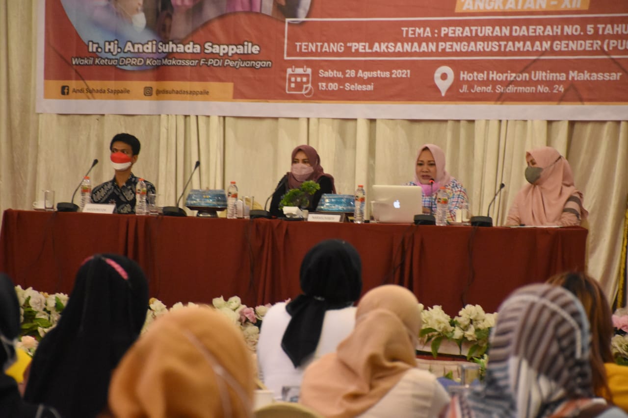 MAKASSAR, DATAKITA.CO – Wakil Ketua DPRD Makassar, Andi Suhada Sappaile menggelar Sosialisasi Peraturan Daerah (Perda) Nomor 5 tahun 2019 tentang Pengarusutamaan Gender (PUG) dalam Pembangunan, di Hotel Horison, Sabtu (28/8/2021).