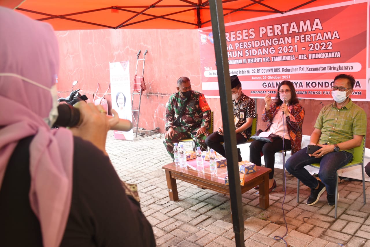 MAKASSAR, DATAKITA.CO – Anggota DPRD Kota Makassar, Galmerrya Kondorura melaksanakan reses pertama masa persidangan pertama tahun 2021-2022. Tujuannya, menyerap aspirasi masyarakat di daerah pemilihahannya.
